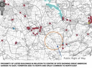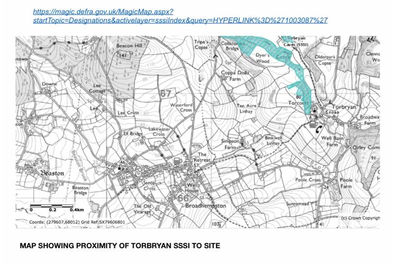 Any proposal would adversely affect the integrity of the South Hams Special Area of Conservation and the SSSI of Torbryan Caves. There are intervisibility issues concerning Dartmoor National Park ( especially the distinctive skyline features of Haytor, Saddle Tor and Rippon Tor) and The Iron Age Hill Setlement at Denbury Down). It would impact the range of biodiversity and geodiversity of the surrounding countryside, as well as on the medieval field landscape and use valuable agricultural land.