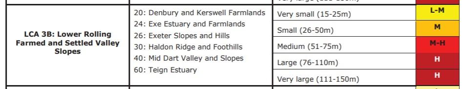 ‘The assessment also notes that the LCT would be highly sensitive to turbine clusters larger than 5 turbines. This indicates that the landscape will be particularly sensitive to turbines greater than 51m and unlikely to be able to accommodate turbines over 76m to tip, or any developments comprising more than 5 turbines (sic) without introducing a change to landscape character’ (source https://teignbridge.gov.uk/media/6357/wind-web.pdf)